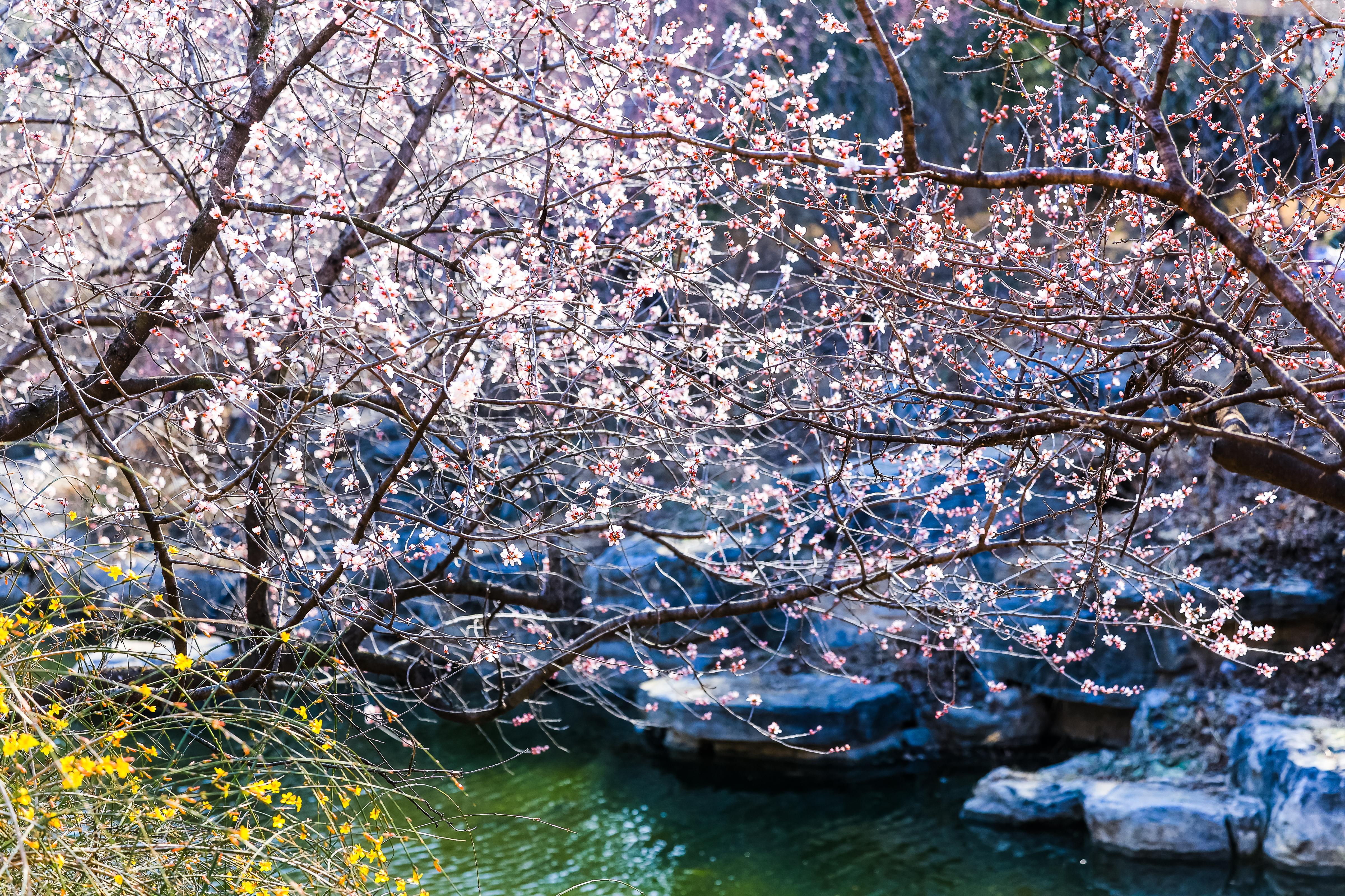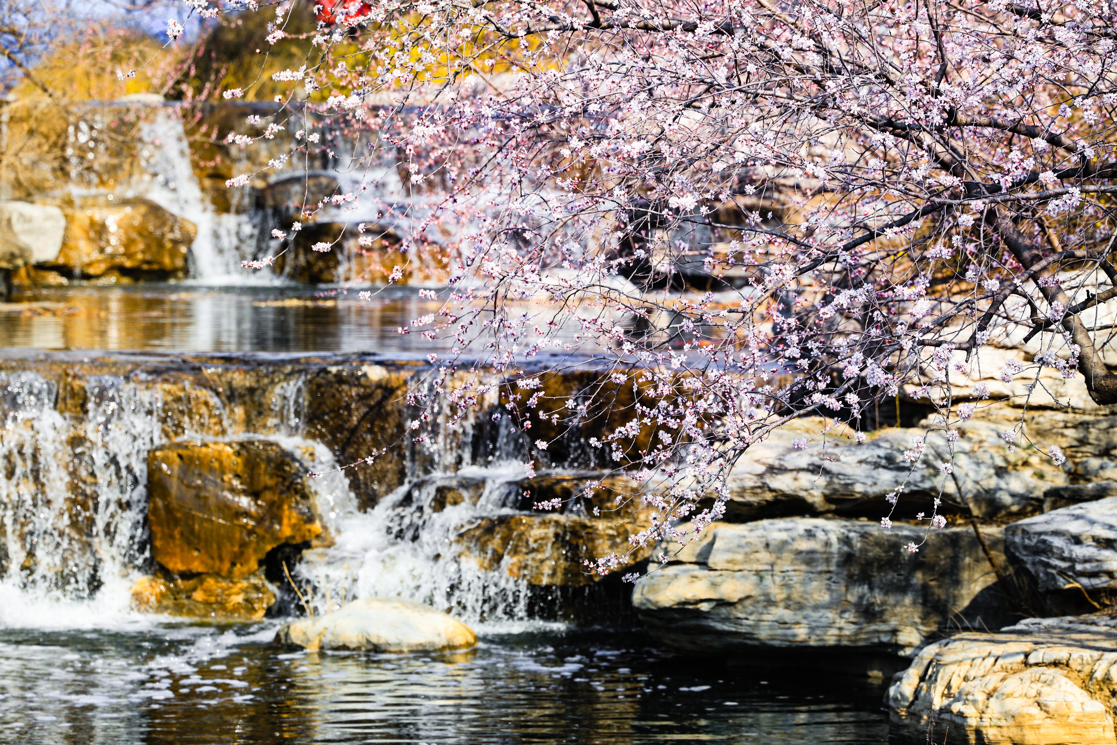 山桃花溪位于国家植物园(北园)曹雪芹纪念馆西侧。远远望去,叠水蜿蜒,清浅碧波顺石而下,粉白山桃一展芳颜、临水而立,层层花影点亮满园春色,临水照花尽显春日柔情,勾勒出温润恬淡的唯美意境。
