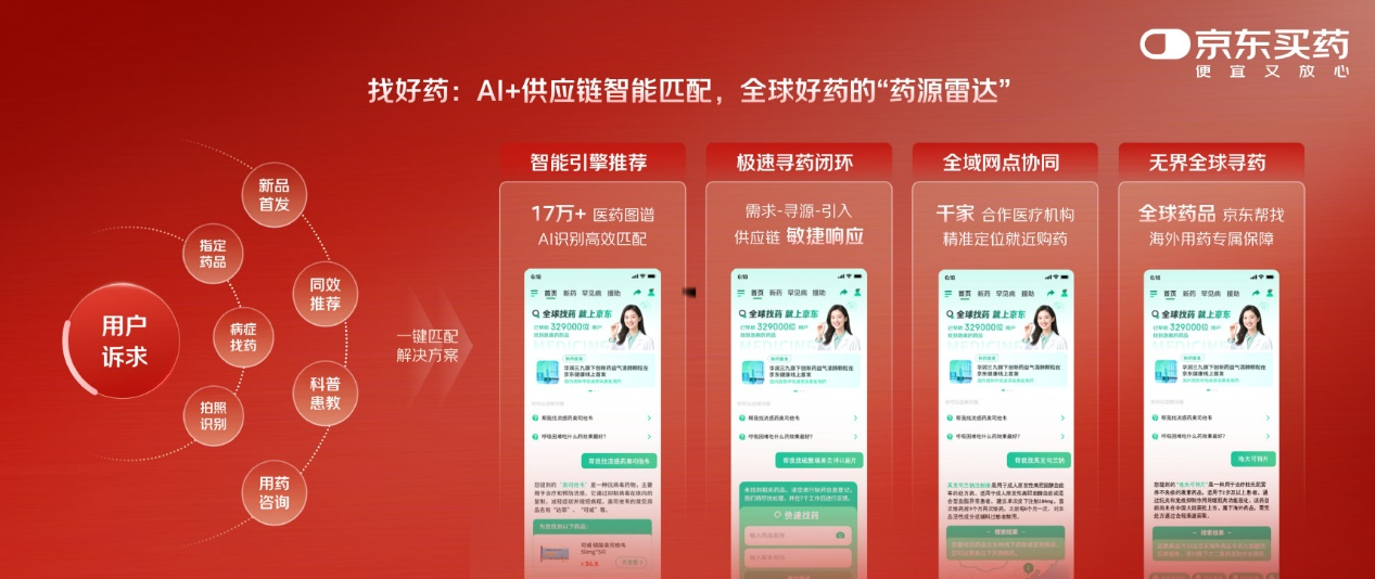 大会首次系统性展示的药智模型,成为京东大药房数智化转型的核心支撑。该模型基于4000万权威知识源、200万医疗实体及亿级用户行为训练而成,可通过AI药师提供7×24小时个性化用药指导,通过AI全球找药实现用药需求极速闭环,为药企定制智能体助力其向数据驱动转型,同时升级AI医生智能体集群,提供全周期健康管理服务。