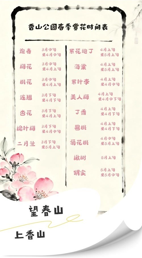 望春山,上香山。本周园内梅花、山桃花已开,玉兰、连翘、二月兰也将次第盛放,在此提醒游客文明赏花,共同维护这份春日的美好。