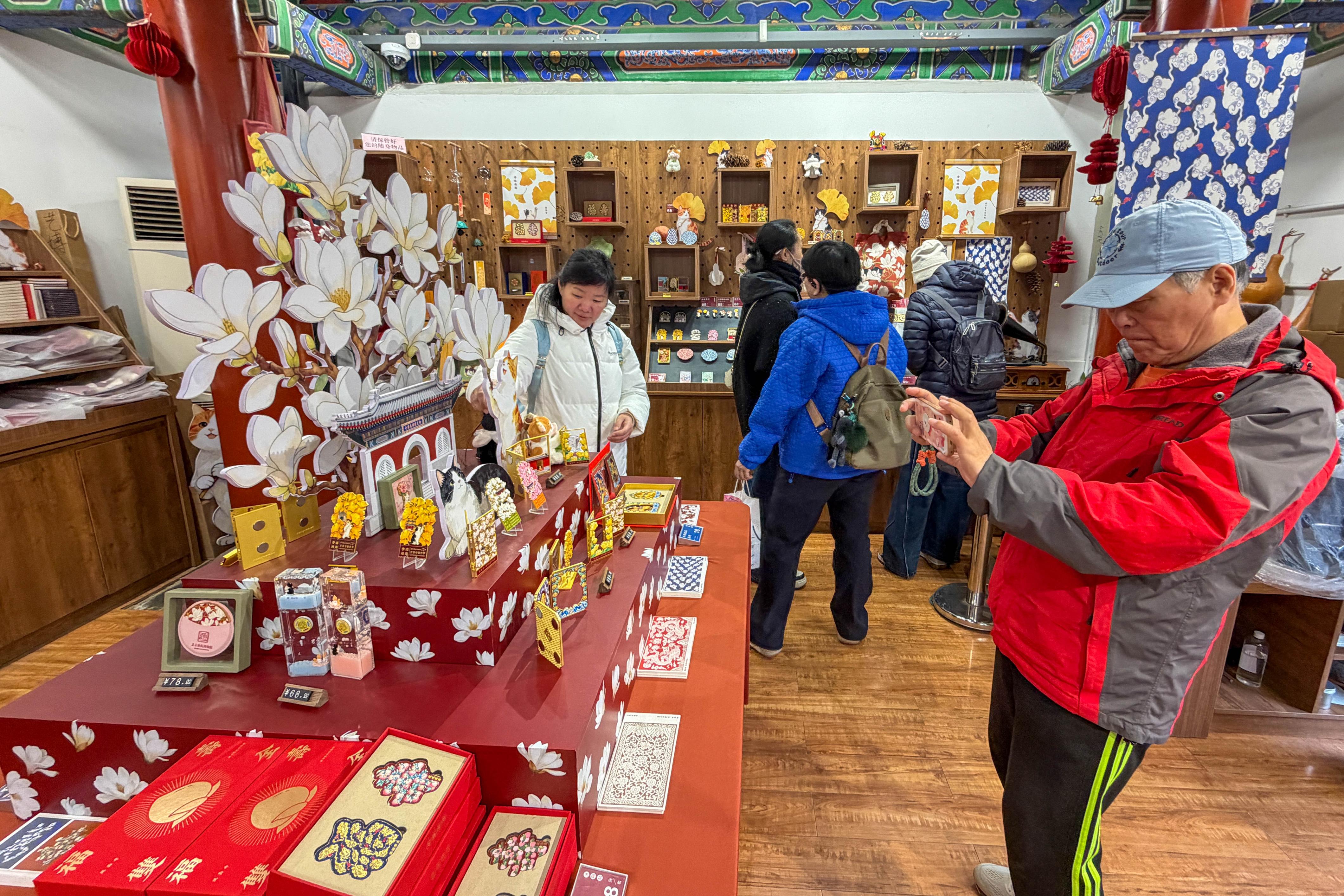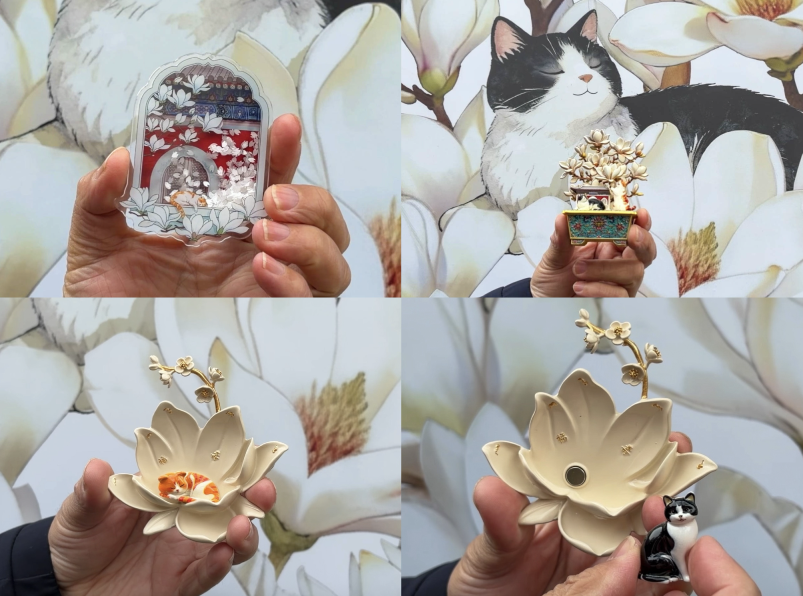 玉兰树旁的“玉兰小铺”也是人头攒动,宅男宅女爱爱体检区玉兰已经在展台“绽放”。几款新推出的冰箱贴成为热销品。刚到货的两款都动态十足:一款是立体盆栽造型,将万寿寺山门殿、玉兰花与馆内灵动的猫咪收于方寸之间;还有一款是流沙冰箱贴,捕捉了天王殿前猫咪酣睡的场景,轻轻翻转,玉兰花瓣在光影中熠熠生辉。