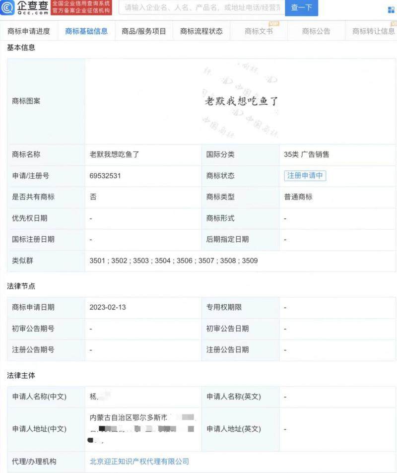 此外,“老默我想吃鱼了”商标已被自然人杨某某申请注册,国际分类为广告销售,目前商标状态为“注册申请中”。