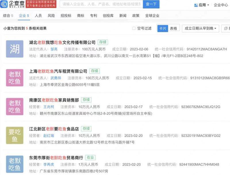 据悉,宅男宅女爱爱体检区多家名为“老默吃鱼”公司成立,久久久亚洲国产精品乱码久久久久久中文字幕一区涉及湖北、上海、东莞等地,其中成立日期最早的为2月6日。